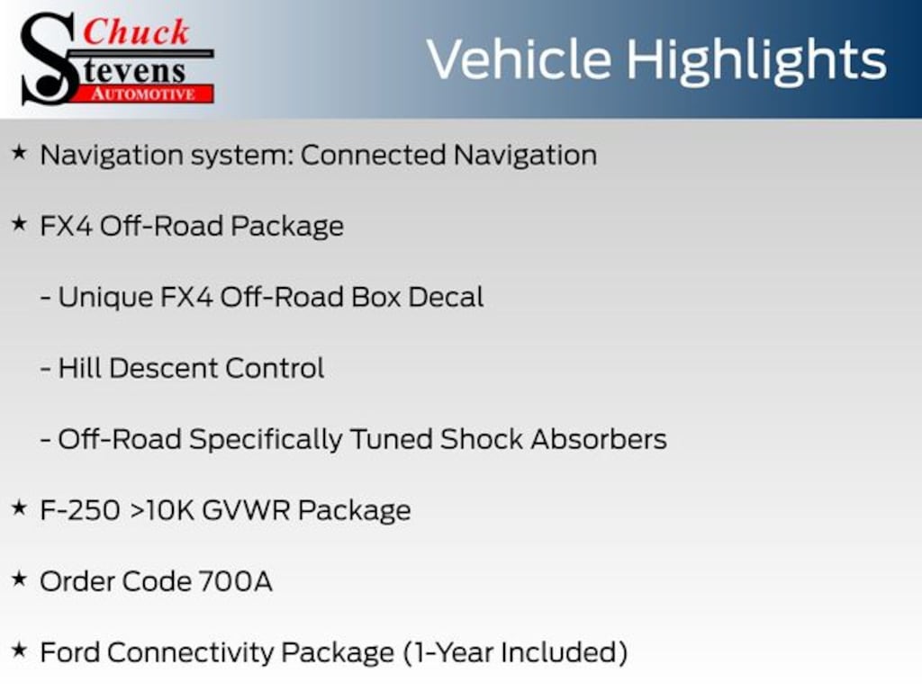 2 Black Retractable Bed Hooks by Bull Accessories, ABS brakes, Adjustable pedals, Alloy wheels, Auto High-beam Headlights, Auto tilt-away steering wheel, Automatic temperature control, Compass, Electronic Stability Control, Electronic-Locking w/3.73 Axle Ratio, Emergency communication system: SYNC 4 911 Assist, F-250 >10K GVWR Package, Flow-Through Console, Ford Connectivity Package (1-Year Included), Front dual zone A/C, Front fog lights, Fully automatic headlights, FX4 Off-Road Package, Garage door transmitter, Heads-Up Display, Heated door mirrors, Heated front seats, Heated rear seats, Heated steering wheel, Hill Descent Control, Illuminated entry, Internet access capable: 5G Modem - Ford Connectivity Package, Low tire pressure warning, Memory seat, Navigation system: Connected Navigation, Off-Road Specifically Tuned Shock Absorbers, Order Code 700A, Pedal memory, Power passenger seat, Radio: B&O Unleashed Sound System by Bang & Olufsen, Rain sensing wipers, Remote keyless entry, SiriusXM w/360L, Steering wheel memory, Steering wheel mounted A/C controls, Steering wheel mounted audio controls, SYNC 4 w/Enhanced Voice Recognition, Traction control, Trip computer, Turn signal indicator mirrors, Unique King Ranch Leather 40/Console/40 Seats, Variably intermittent wipers, Ventilated front seats, Wheels: 20" Bright Machined Aluminum.