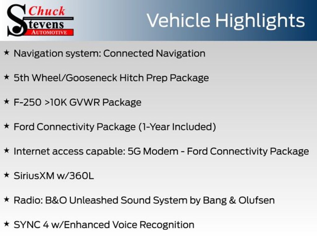 5th Wheel/Gooseneck Hitch Prep Package, ABS brakes, Adjustable pedals, Alloy wheels, Compass, Electronic Stability Control, Electronic-Locking w/3.31 Axle Ratio, Emergency communication system: SYNC 4 911 Assist, F-250 >10K GVWR Package, Ford Connectivity Package (1-Year Included), Front dual zone A/C, Front fog lights, Fully automatic headlights, Heads-Up Display, Heated door mirrors, Heated front seats, Heated rear seats, Illuminated entry, Internet access capable: 5G Modem - Ford Connectivity Package, Low tire pressure warning, Memory seat, Navigation system: Connected Navigation, Pedal memory, Radio: B&O Unleashed Sound System by Bang & Olufsen, Rain sensing wipers, Remote keyless entry, SiriusXM w/360L, Steering wheel mounted A/C controls, Steering wheel mounted audio controls, SYNC 4 w/Enhanced Voice Recognition, Tough Bed Spray-In Bedliner, Traction control, Variably intermittent wipers, Wheels: 20" Bright Machined Aluminum.