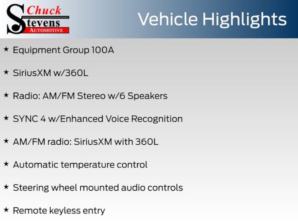 2K Trailer Hitch Receiver w/4-Pin Connector, AM/FM radio: SiriusXM with 360L, Apple CarPlay/Android Auto, Auto High-beam Headlights, Automatic temperature control, Delay-off headlights, Emergency communication system: SYNC 4 911 Assist, Equipment Group 100A, Exterior Parking Camera Rear, Front Bucket Seats, Fully automatic headlights, Pre-Collision Assist w/Automatic Emergency Braking, Radio: AM/FM Stereo w/6 Speakers, Rear-View Camera, Remote keyless entry, SiriusXM w/360L, Steering wheel mounted audio controls, SYNC 4 w/Enhanced Voice Recognition, Telescoping steering wheel, Tilt steering wheel, Wheels: 17" Steel w/Sparkle Silver Painted Cover.