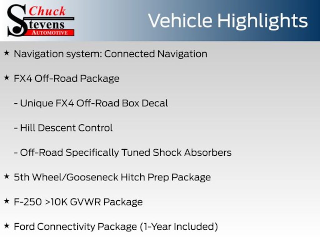 5th Wheel/Gooseneck Hitch Prep Package, Adjustable pedals, Alloy wheels, Automatic temperature control, Electronic-Locking w/3.31 Axle Ratio, Emergency communication system: SYNC 4 911 Assist, F-250 >10K GVWR Package, Ford Connectivity Package (1-Year Included), Front dual zone A/C, Front fog lights, Fully automatic headlights, FX4 Off-Road Package, Hill Descent Control, Internet access capable: 5G Modem - Ford Connectivity Package, Memory seat, Navigation system: Connected Navigation, Off-Road Specifically Tuned Shock Absorbers, Pedal memory, Radio: B&O Unleashed Sound System by Bang & Olufsen, Rain sensing wipers, SiriusXM w/360L, Steering wheel mounted A/C controls, Steering wheel mounted audio controls, SYNC 4 w/Enhanced Voice Recognition, Unique FX4 Off-Road Box Decal, Variably intermittent wipers.