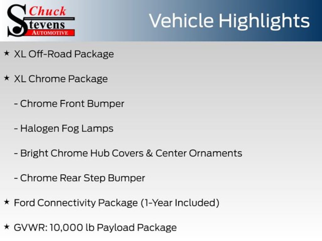 17" Argent Painted Steel Wheels, Bright Chrome Hub Covers & Center Ornaments, Chrome Front Bumper, Chrome Rear Step Bumper, Electronic-Locking w/3.73 Axle Ratio, Ford Connectivity Package (1-Year Included), GVWR: 10,000 lb Payload Package, Halogen Fog Lamps, Internet access capable: 5G Modem - Ford Connectivity Package, Platform Running Boards, Telescoping steering wheel, Tilt steering wheel, Variably intermittent wipers, XL Chrome Package, XL Off-Road Package.