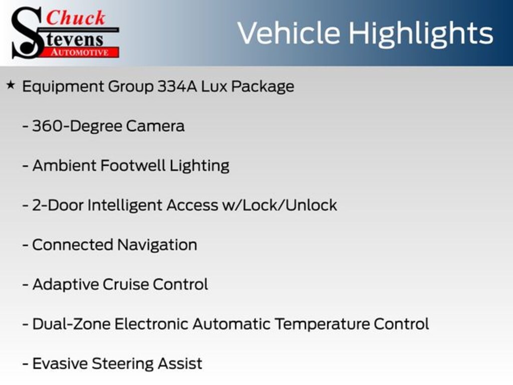 2-Door Intelligent Access w/Lock/Unlock, 360-Degree Camera, 4.7 Final Drive Ratio, Adaptive Cruise Control, Alloy wheels, Ambient Footwell Lighting, Carbonized Gray Molded-In-Color Hard Top, Connected Navigation, Dr & Pass Illuminated Sliding Visor Vanity Mirrors, Dual Smart Charging USB Ports, Dual-Zone Electronic Automatic Temperature Control, Emergency communication system: 911 Assist, Equipment Group 334A Lux Package, Evasive Steering Assist, Exterior Parking Camera Rear, Ford Performance Heavy-Duty Modular Front Bumper, Front fog lights, Front Parking Sensors, Front Row Heated Seats, Fully automatic headlights, Heated front seats, High Clearance Fender Flares, High Clearance Suspension, Information on Demand Panel, Low tire pressure warning, Position-Sensitive Bilstein Shock Absorbers, Power Outlet - Back Side of Center Floor Console, Radio: B&O Sound System by Bang & Olufsen, Rear Parking Sensors, Rear-Window Defroster & Washer, Sasquatch Package, Sideview Mirrors, Telescoping steering wheel, Tilt steering wheel, Trailer Tow Package (DIO), Universal Garage Door Opener, Variably intermittent wipers, Wheels: 17" Carbonized Gray Painted Aluminum.