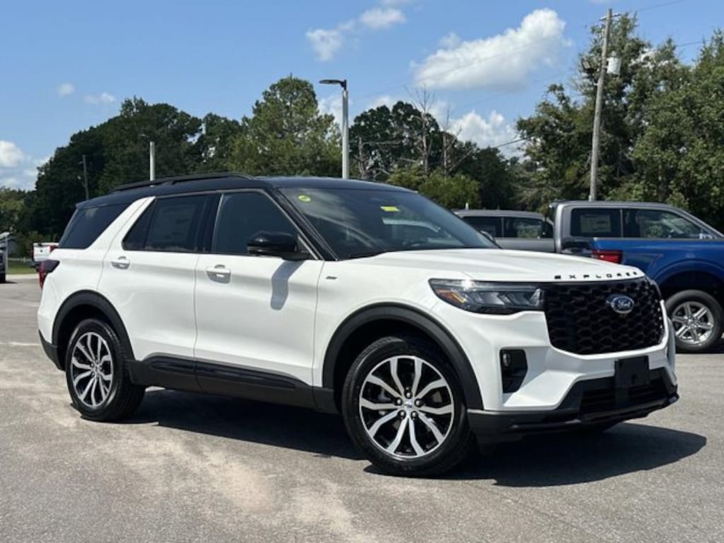 Take a closer look at this Star White Metallic Tri-Coat 2025 Ford Explorer, featuring Onyx w/Heated Unique Cloth Captain's Chairs interior and powered by a 2.3L EcoBoost I-4. The Explorer ST-Line is hardy and built to march on under any circumstance, making it a smart choice for drivers who want performance, comfort, and reliability in one package.