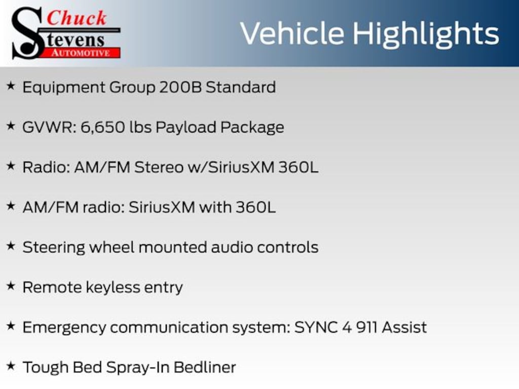 Alloy wheels, AM/FM radio: SiriusXM with 360L, Electronic Locking w/3.55 Axle Ratio, Emergency communication system: SYNC 4 911 Assist, Equipment Group 200B Standard, Front Bucket Seats, GVWR: 6,650 lbs Payload Package, Radio: AM/FM Stereo w/SiriusXM 360L, Remote keyless entry, Steering wheel mounted audio controls, SYNC 4 w/Enhanced Voice Recognition, Telescoping steering wheel, Tilt steering wheel, Tough Bed Spray-In Bedliner, Wheels: 18" Gloss Black.