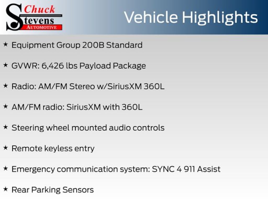 3.55 Axle Ratio, Alloy wheels, AM/FM radio: SiriusXM with 360L, Emergency communication system: SYNC 4 911 Assist, Equipment Group 200B Standard, GVWR: 6,426 lbs Payload Package, Radio: AM/FM Stereo w/SiriusXM 360L, Rear Parking Sensors, Remote keyless entry, Steering wheel mounted audio controls, SYNC 4 w/Enhanced Voice Recognition, Telescoping steering wheel, Tilt steering wheel, Trip computer, Variably intermittent wipers, Wheels: 18" Gloss Black.