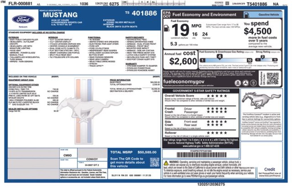 Take a closer look at this Silver 2026 Ford Mustang, featuring interior and powered by a 5.0L V8 Ti-VCT. The Mustang is tremendous and built to march on under any circumstance, making it a smart choice for drivers who want performance, comfort, and reliability in one package.