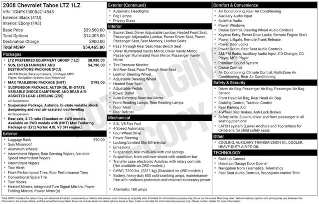 Welcome to Chuck Stevens Chevrolet located on HWY 31 South, Bay Minette Alabama. We are home of Lifetime Powertrain Warranty. A Lifetime Powertrain Warranty at no additional cost.Grab a great deal with our low-price guarantee on this 2008 Chevrolet Tahoe LTZ while we still have it. At Chuck Stevens Chevrolet our Pre-Owned vehicles have been fully inspected and reconditioned by a certified technician. The Black 2008 Chevrolet Tahoe LTZ with Black interior is a wonderful choice.The online price includes a $2,500 Cash Down or trade equity. To qualify, customers must trade in a vehicle with a minimum appraised value of $2,500 or Cash Down. All prices reflect dealership financing and include a $1,000 finance coupon. See dealer for full details.- SUN, ENTERTAINMENT AND DESTINATIONS PACKAGE- MAX TRAILERING PACKAGE- LUGGAGE RACK CENTER RAILS- Heavy-Duty Air-to-Oil Auxiliary Transmission Oil Cooler- Tilt steering wheelThis well-equipped 2008 Chevrolet Tahoe LTZ is the perfect blend of power, capability, and comfort. Under the hood, you'll find the robust Vortec 5.3L V8 SFI Flex Fuel engine paired with a 4-speed automatic transmission, providing a smooth and efficient driving experience. With 4-wheel drive, this Tahoe is ready to take on any terrain, whether you're towing a trailer or navigating through inclement weather.The LTZ trim level adds a touch of luxury, with features like dual-zone automatic climate control, a power sunroof, and a premium audio system with navigation and rear-seat entertainment. The rearview camera and rear parking sensors make maneuvering a breeze, while the Max Trailering Package ensures you have the towing capacity to handle your larger cargo and recreational needs.Boasting a spacious and versatile interior, the 2008 Chevrolet Tahoe LTZ offers seating for up to eight passengers, with ample room for cargo and equipment. The split-folding rear seats and available roof rails provide the flexibility to accommodate your ever-changing lifestyle.With a sleek, bold exterior and a well-appointed cabin, this Tahoe is sure to turn heads and impress your family and friends. Combine its impressive capabilities with the peace of mind of our Lifetime Powertrain Warranty, and you have a vehicle that's built to last and ready to take on any adventure.LIFETIME POWERTRAIN WARRANTY PROGRAM is included at no additional charge for all vehicles that have less than 80,000 miles. It is one of the most comprehensive powertrain warranty programs in the market. See dealer for details.