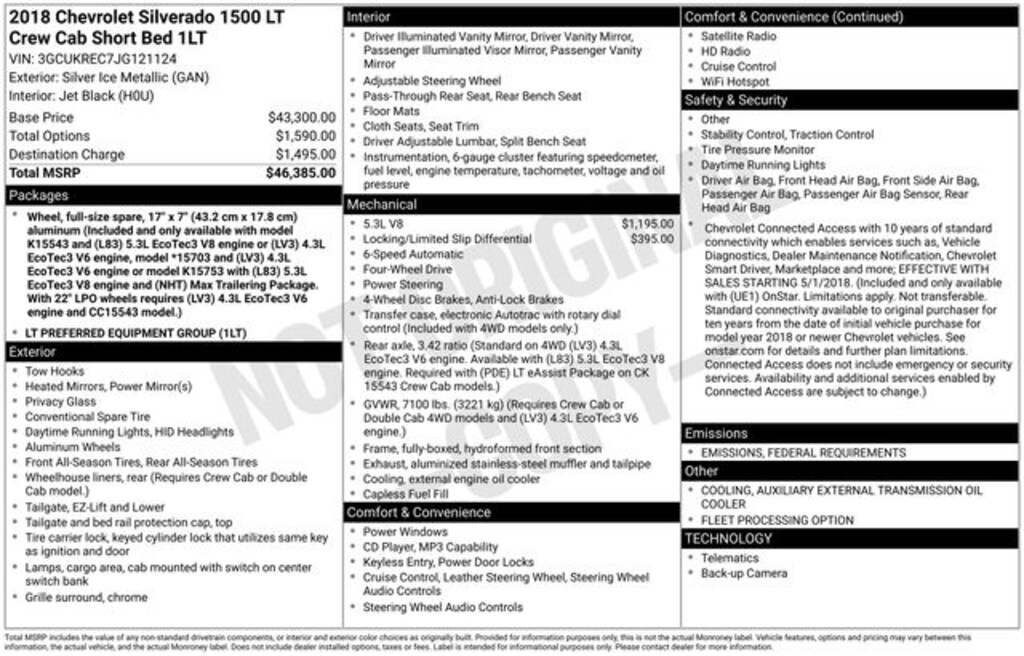 2018 Chevrolet Silverado 1500 LT LT1 4D Crew Cab LT LT1 Silver Ice Metallic 4WD EcoTec3 5.3L V8 6-Speed Automatic Electronic with Overdrive