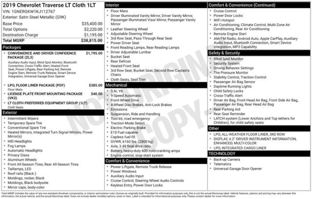 2019 Chevrolet Traverse LT Cloth w/1LT 4D Sport Utility LT Cloth w/1LT Satin Steel Metallic FWD 3.6L V6 SIDI VVT 9-Speed Automatic