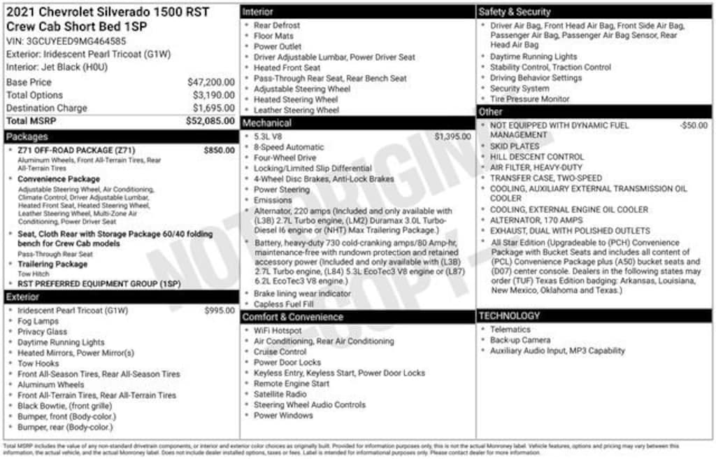 Welcome to Chuck Stevens Chevrolet located on HWY 31 South, Bay Minette Alabama. We are home of Lifetime Powertrain Warranty. A Lifetime Powertrain Warranty at no additional cost. Grab a great deal with our low-price guarantee on this 2021 Chevrolet Silverado 1500 while we still have it. At Chuck Stevens Chevrolet our Pre-Owned vehicles have been fully inspected and reconditioned by a certified technician. The Iridescent Pearl Tricoat 2021 Chevrolet Silverado 1500 with Black Cloth interior is a terrific choice.The online price includes a $2,500 Cash Down or trade equity. To qualify, customers must trade in a vehicle with a minimum appraised value of $2,500 or Cash Down. All prices reflect dealership financing and include a $1,000 finance coupon. See dealer for full details.Clean CARFAX.Recent Arrival! Odometer is 51178 miles below market average!2021 Chevrolet Silverado 1500 RST Iridescent Pearl Tricoat 4D Crew Cab RST 4WD EcoTec3 5.3L V8 8-Speed AutomaticLIFETIME POWERTRAIN WARRANTY PROGRAM is included at no additional charge for all vehicles that have less than 80,000 miles. It is one of the most comprehensive powertrain warranty programs in the market. See dealer for details.