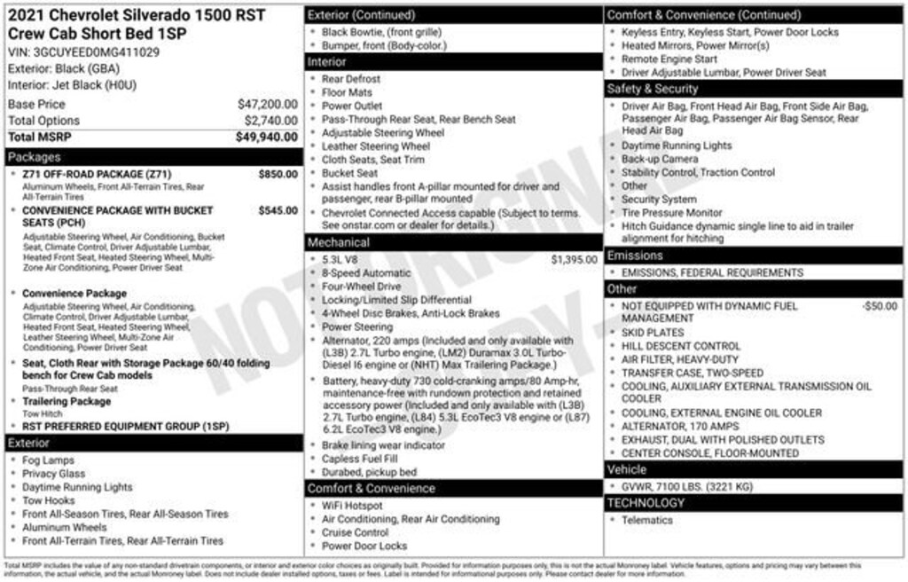 Welcome to Chuck Stevens Chevrolet located on HWY 31 South, Bay Minette Alabama. We are home of Lifetime Powertrain Warranty. A Lifetime Powertrain Warranty at no additional cost. Grab a great deal with our low-price guarantee on this 2021 Chevrolet Silverado 1500 while we still have it. At Chuck Stevens Chevrolet our Pre-Owned vehicles have been fully inspected and reconditioned by a certified technician. The Black 2021 Chevrolet Silverado 1500 with Black Cloth interior is an outstanding choice.The online price includes a $2,500 Cash Down or trade equity. To qualify, customers must trade in a vehicle with a minimum appraised value of $2,500 or Cash Down. All prices reflect dealership financing and include a $1,000 finance coupon. See dealer for full details.Recent Arrival!2021 Chevrolet Silverado 1500 RST Black 4D Crew Cab RST 4WD EcoTec3 5.3L V8 8-Speed AutomaticLIFETIME POWERTRAIN WARRANTY PROGRAM is included at no additional charge for all vehicles that have less than 80,000 miles. It is one of the most comprehensive powertrain warranty programs in the market. See dealer for details.