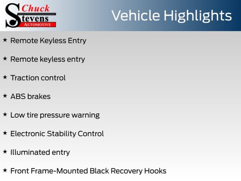 ABS brakes, Electronic Stability Control, Front Frame-Mounted Black Recovery Hooks, Illuminated entry, Low tire pressure warning, Remote Keyless Entry, Remote keyless entry, Traction control.