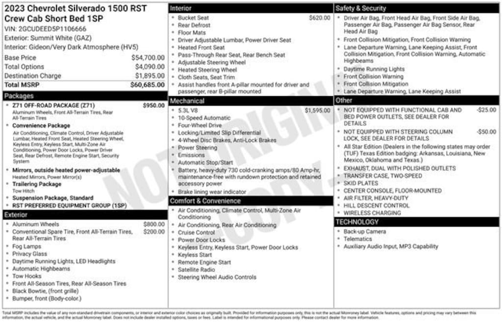 Welcome to Chuck Stevens Chevrolet located on HWY 31 South, Bay Minette Alabama. We are home of Lifetime Powertrain Warranty. A Lifetime Powertrain Warranty at no additional cost. Grab a great deal with our low-price guarantee on this 2023 Chevrolet Silverado 1500 while we still have it.At Chuck Stevens Chevrolet our Pre-Owned vehicles have been fully inspected and reconditioned by a certified technician. The Summit White 2023 Chevrolet Silverado 1500 with Gideon/Very Dark Atmosphere Cloth interior is a great choice.Clean CARFAX.Recent Arrival!2023 Chevrolet Silverado 1500 RST Summit White 4D Crew Cab RST 4WD EcoTec3 5.3L V8 10-Speed AutomaticLIFETIME POWERTRAIN WARRANTY PROGRAM is included at no additional charge for all vehicles that have less than 80,000 miles. It is one of the most comprehensive powertrain warranty programs in the market. See dealer for details.