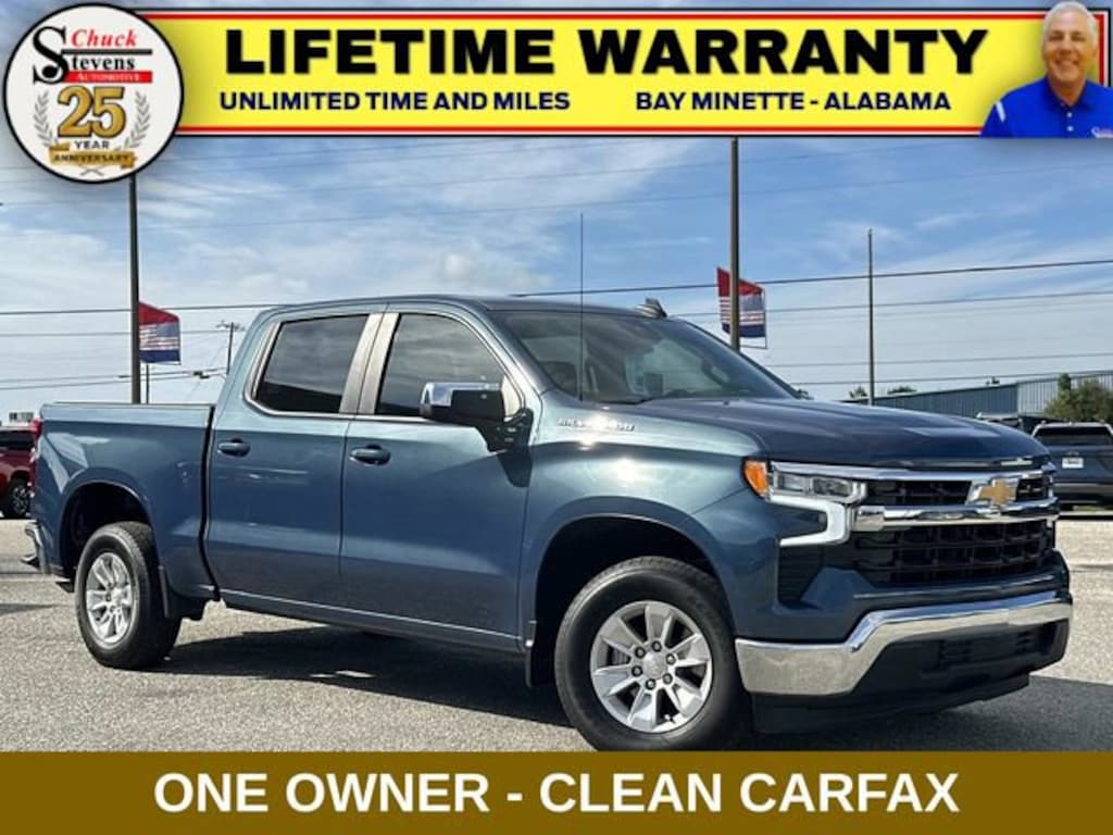 Welcome to Chuck Stevens Chevrolet located on HWY 31 South, Bay Minette Alabama. We are home of Lifetime Powertrain Warranty. A Lifetime Powertrain Warranty at no additional cost. Grab a great deal with our low-price guarantee on this 2024 Chevrolet Silverado 1500 while we still have it. At Chuck Stevens Chevrolet our Pre-Owned vehicles have been fully inspected and reconditioned by a certified technician. The Lakeshore Blue Metallic 2024 Chevrolet Silverado 1500 with Black Cloth interior is a superb choice.