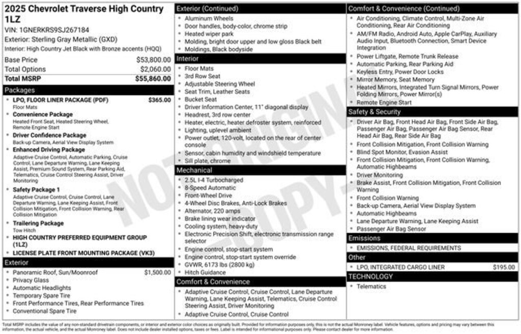 Welcome to Chuck Stevens Chevrolet located on HWY 31 South, Bay Minette Alabama. We are home of Lifetime Powertrain Warranty. A Lifetime Powertrain Warranty at no additional cost. Grab a great deal with our low-price guarantee on this 2025 Chevrolet Traverse while we still have it. At Chuck Stevens Chevrolet our Pre-Owned vehicles have been fully inspected and reconditioned by a certified technician. The Sterling Gray Metallic 2025 Chevrolet Traverse with High Country Jet Black With Bronze Accents Leather interior is a superb choice.