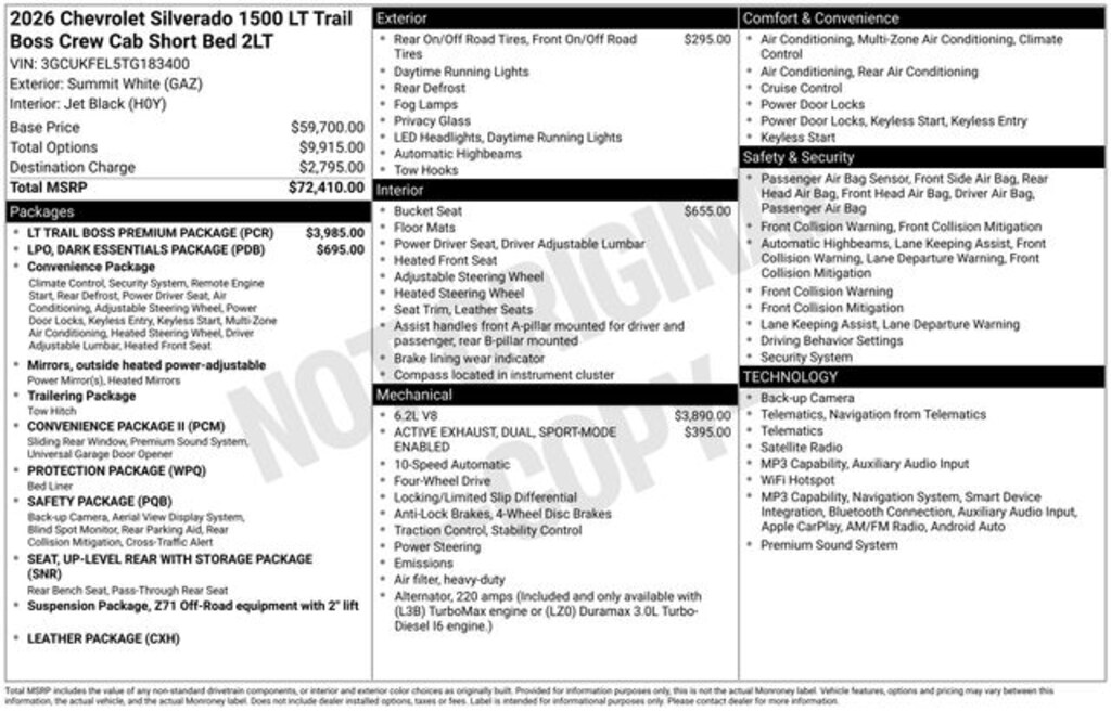 2026 Chevrolet Silverado 1500 LT Trail Boss 4D Crew Cab LT Trail Boss Summit White 4WD EcoTec3 6.2L V8 10-Speed Automatic