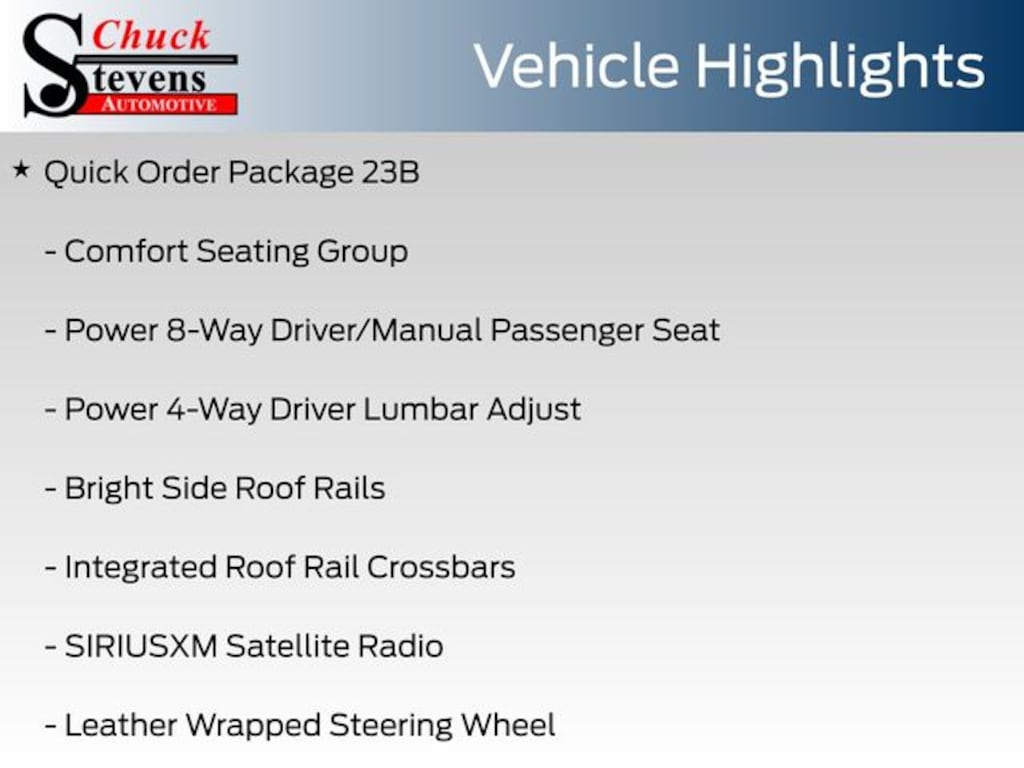 At Chuck Stevens Ford, we also include our exclusive Lifetime Powertrain Warranty at no additional cost. Serviceable at any certified repair facility nationwide.