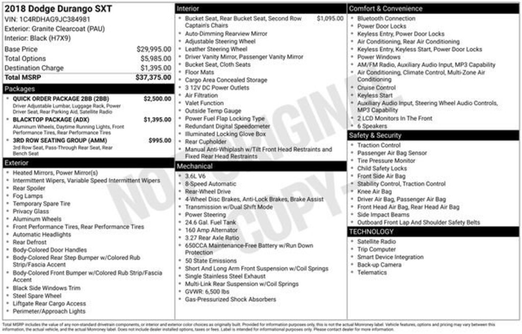 Welcome to Chuck Stevens Chevrolet located on HWY 31 South, Bay Minette Alabama. We are home of Lifetime Powertrain Warranty. A Lifetime Powertrain Warranty at no additional cost. Grab a great deal with our low-price guarantee on this 2018 Dodge Durango while we still have it. At Chuck Stevens Chevrolet our Pre-Owned vehicles have been fully inspected and reconditioned by a certified technician. The Granite Metallic Clearcoat 2018 Dodge Durango with Black Cloth interior is an outstanding choice.The online price includes a $2,500 Cash Down or trade equity. To qualify, customers must trade in a vehicle with a minimum appraised value of $2,500 or Cash Down. All prices reflect dealership financing and include a $1,000 finance coupon. See dealer for full details.Recent Arrival! 19/26 City/Highway MPG2018 Dodge Durango SXT Granite Metallic Clearcoat 4D Sport Utility SXT RWD 3.6L V6 24V VVT 8-Speed AutomaticLIFETIME POWERTRAIN WARRANTY PROGRAM is included at no additional charge for all vehicles that have less than 80,000 miles. It is one of the most comprehensive powertrain warranty programs in the market. See dealer for details.