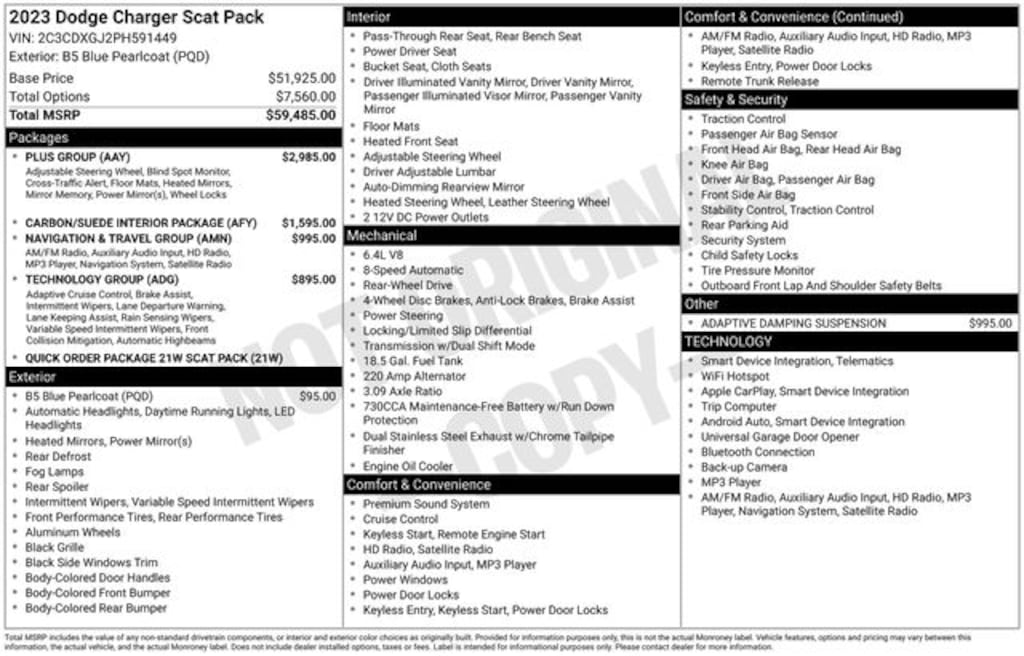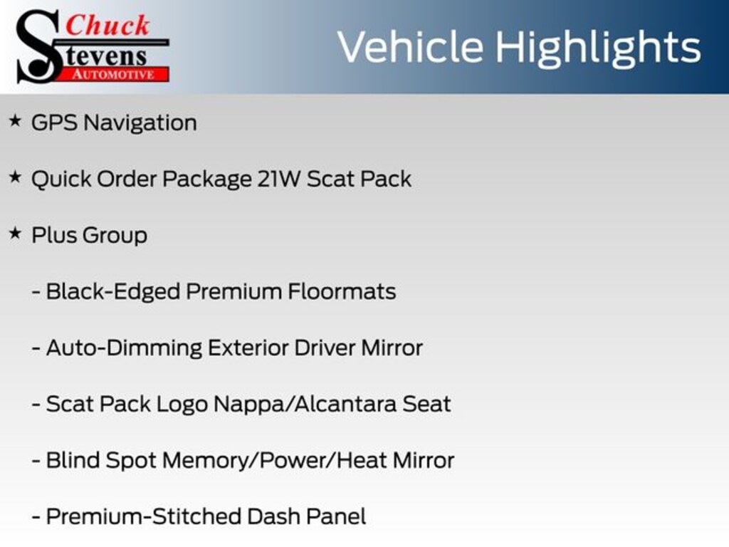 1-Yr SiriusXM Guardian Trial, 2-Piece Shark Fin Antenna, 4G LTE Wi-Fi Hot Spot, 5-Year SiriusXM Traffic Service, 5-Year SiriusXM Travel Link Service, 8.4" Touchscreen Display, Adaptive Cruise Control w/Stop, Advanced Brake Assist, Alloy wheels, Apple CarPlay, Auto Adjust In Reverse Exterior Mirrors, Auto High Beam Headlamp Control, Auto-Dimming Exterior Driver Mirror, Black-Edged Premium Floormats, Blind Spot & Cross Path Detection, Blind Spot Memory/Power/Heat Mirror, Carbon/Suede Interior Package, Compass Gauge, Driver & Passenger Lower LED Lamps, Exterior Mirrors Courtesy Lamps, Exterior Mirrors w/Heating Element, For Details, Visit DriveUconnect.com, Front Overhead LED Lighting, Full Speed FWD Collision Warn Plus, Google Android Auto, GPS Antenna Input, GPS Navigation, HD Radio, Heated Front Seats, Integrated Center Stack Radio, Integrated Voice Command w/Bluetooth, Lane Departure Warning Plus, Media Hub (2 USB, AUX), Navigation & Travel Group, Plus Group, Power 2-Way Driver Lumbar Adjust, Power 2-Way Passenger Lumbar Adjust, Power Front Driver/Passenger Seats, Power Tilt/Telescope Steering Column, Premium-Stitched Dash Panel, Quick Order Package 21W Scat Pack, Radio: Uconnect 4C Nav w/8.4" Display, Radio/Driver Seat/Mirrors Memory, Rain Sensitive Windshield Wipers, Real Carbon Fiber Interior Accents, Rear Armrest w/Cupholder Seat, Scat Pack Logo Nappa/Alcantara Seat, SiriusXM Traffic Plus, SiriusXM Travel Link, Suede Headliner, Technology Group, USB Host Flip, Ventilated Front Seats, Wheels: 20" x 9.5" Low-Gloss Black Knurled.