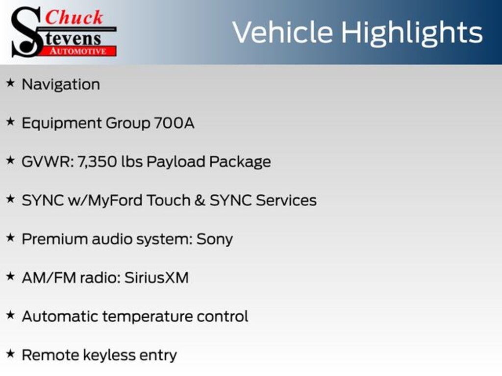 20" Polished Aluminum Wheels, Adjustable pedals, Alloy wheels, AM/FM radio: SiriusXM, Automatic temperature control, Equipment Group 700A, Exterior Parking Camera Rear, Front fog lights, Fully automatic headlights, Garage door transmitter, GVWR: 7,350 lbs Payload Package, Heated front seats, Heated rear seats, High-Intensity Discharge Headlights, Memory seat, Navigation, Overhead Console w/Single Storage Bin, Pedal memory, Power Moonroof, Premium audio system: Sony, Rear Parking Sensors, Rear step bumper, Remote keyless entry, Steering wheel memory, Steering wheel mounted audio controls, SYNC Voice Activated Communication & Entertainment, SYNC w/MyFord Touch & SYNC Services, Telescoping steering wheel, Tilt steering wheel, Trailer Brake Controller, Ventilated front seats, Wheel Well Liner (Pre-Installed).