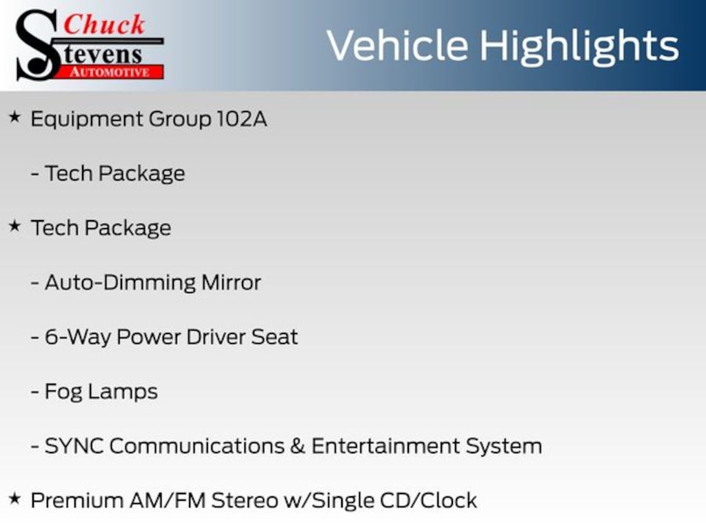 At Chuck Stevens Ford, we also include our exclusive Lifetime Powertrain Warranty at no additional cost. Serviceable at any certified repair facility nationwide.