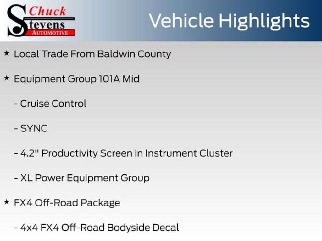 Local Trade From Baldwin County, 20" Machined-Aluminum Wheels, 4.2" Productivity Screen in Instrument Cluster, 4x4 FX4 Off-Road Bodyside Decal, Body-Color Front & Rear Bumpers, Body-Color Surround w/Black Mesh Insert Grille, Box Side Decals, Cruise Control, Driver/Passenger Seat Back Pocket, Equipment Group 101A Mid, Fog Lamps, FX4 Off-Road Package, Hill Descent Control, Illuminated Entry, Manual Driver/Passenger Lumbar, MyKey, Off-Road Tuned Front Shock Absorbers, Perimeter Alarm, Power Door Locks, Power Front & Rear Windows, Power Glass Sideview Mirrors w/Black Skull Caps, Power Tailgate Lock, Rear Window Defroster, Rear Window Fixed Privacy Glass, STX Appearance Package, SYNC, SYNC 3, Unique Sport Cloth 40/20/40 Front-Seats, Wheels: 17" Silver Painted Aluminum, XL Power Equipment Group, XL Sport Appearance Package.
