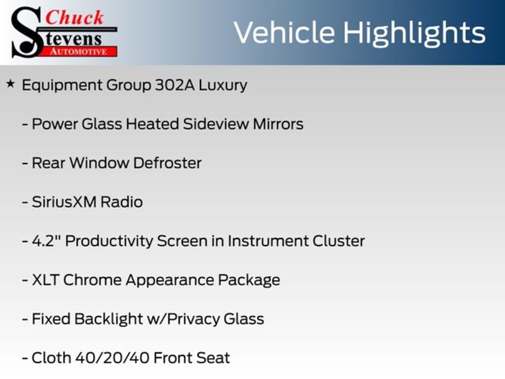 The XLT Chrome Appearance Package elevates the exterior with a chrome-accented grille, door handles, and tailgate, while the XLT Power Equipment Group provides conveniences like power-sliding rear window, LED box lighting, and a 110V/400W outlet. Inside, you'll enjoy the comfort of heated front seats, a leather-wrapped steering wheel, and a 4.2-inch productivity screen in the instrument cluster.