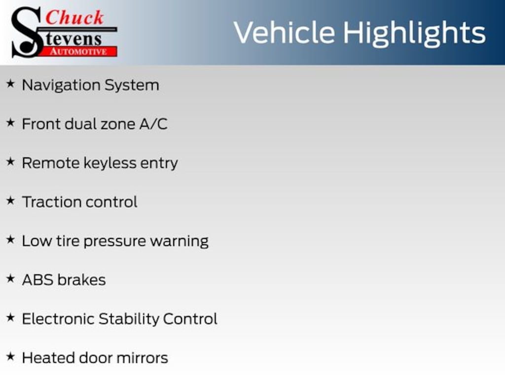 ABS brakes, Alloy wheels, Compass, Electronic Stability Control, Front dual zone A/C, Heated door mirrors, Heated front seats, Heated rear seats, Illuminated entry, Low tire pressure warning, Navigation System, Remote keyless entry, Traction control.