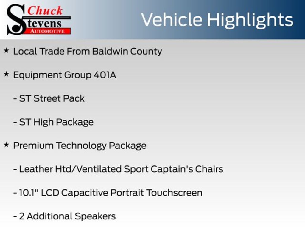 Local Trade From Baldwin County, 10.1" LCD Capacitive Portrait Touchscreen, 110V/150W AC Power Outlet, 2 Additional Speakers, 360-Degree Camera w/Split View, Active Park Assist 2.0, Alloy wheels, Auto-Dimming Rearview Mirror (Interior), Equipment Group 401A, Evasive Steering Assist, Ford Co-Pilot360 Assist+, FordPass Connect, Forward Sensing System, Front Rain-Sensing Wipers, Hands-Free Foot-Activated Liftgate, Intelligent Adaptive Cruise Control, Leather Htd/Ventilated Sport Captain's Chairs, Memory Driver's Seat, Performance Front & Rear Brakes, Power Tilt/Telescoping Steering Column, Premium Technology Package, Radio: B&O Sound System by Bang & Olufsen, Reverse Brake Assist, Second Row Heated Seats, Sideview Mirrors w/Gloss Black Caps, Speed Sign Recognition, ST High Package, ST Street Pack, SYNC 3 Communications & Entertainment System, Third Row PowerFold (Folds Flat), Universal Garage Door Opener (UGDO), Voice-Activated Touchscreen Navigation System, Wheels: 21" Aluminum, Wireless Charging Pad.
