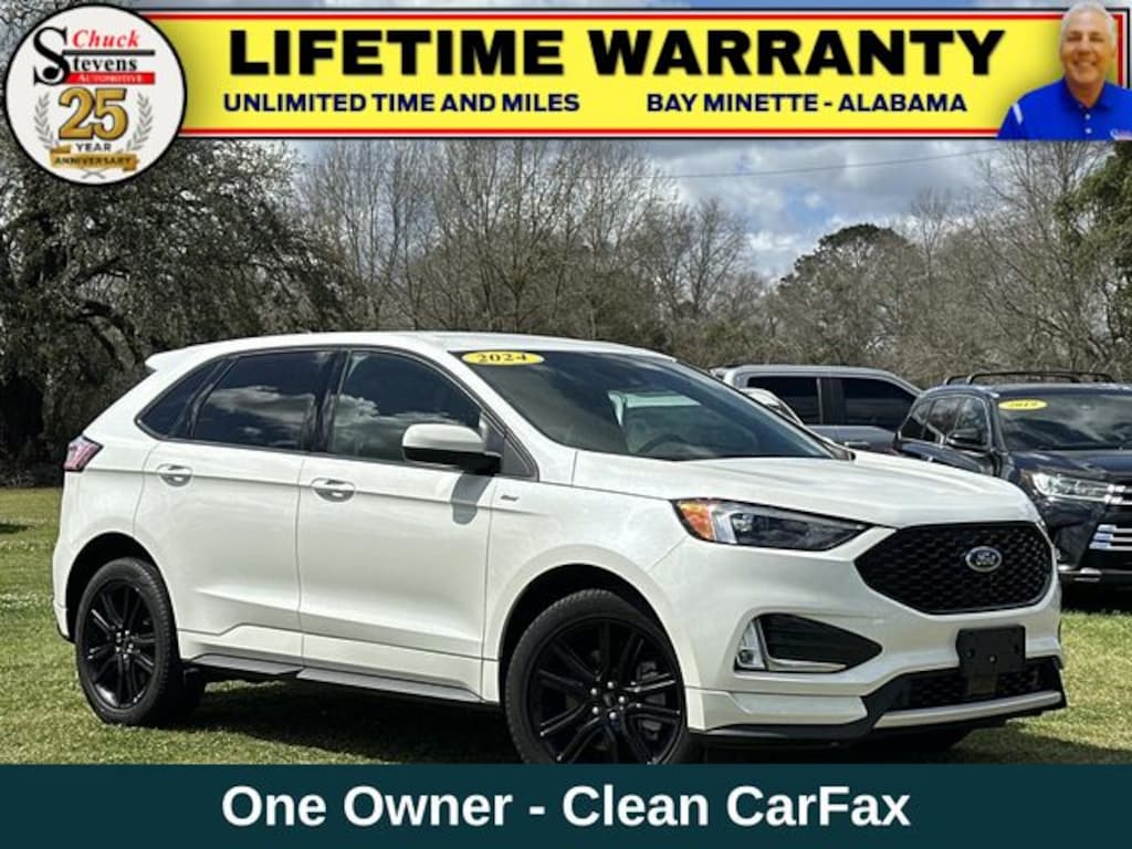Welcome to Chuck Stevens Dodge Chrysler Jeep Ram Fiat located on HWY 31 South, Bay Minette Alabama. We are home of The Lifetime Powertrain Warranty at no additional cost. Grab a great deal with our low-price guarantee on this 2024 Ford Edge ST Line while we still have it. At Chuck Stevens CDJRF our Pre-Owned vehicles have been fully inspected and reconditioned by a certified technician. The White 2024 Ford Edge ST Line with ActiveX Trimmed Heated Bucket Seats interior is a wonderful choice.