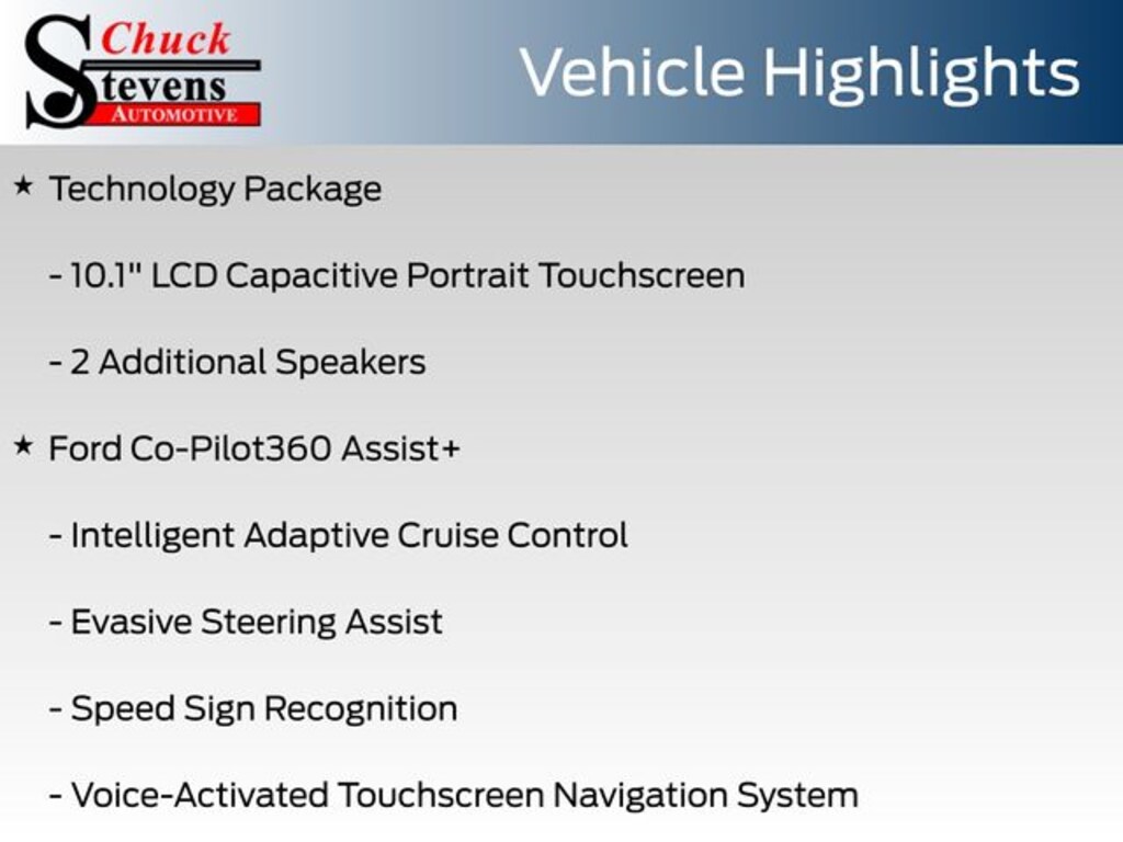At Chuck Stevens Ford, we also include our exclusive Lifetime Powertrain Warranty at no additional cost. No gimmicks, no fine print, and serviceable at any certified repair facility nationwide.