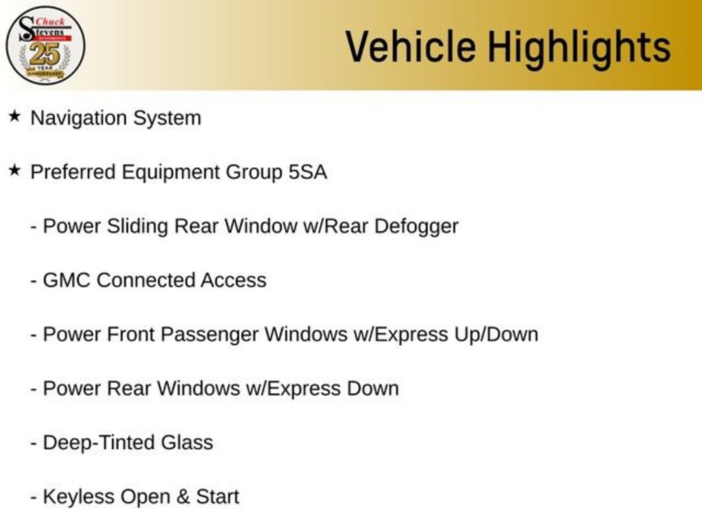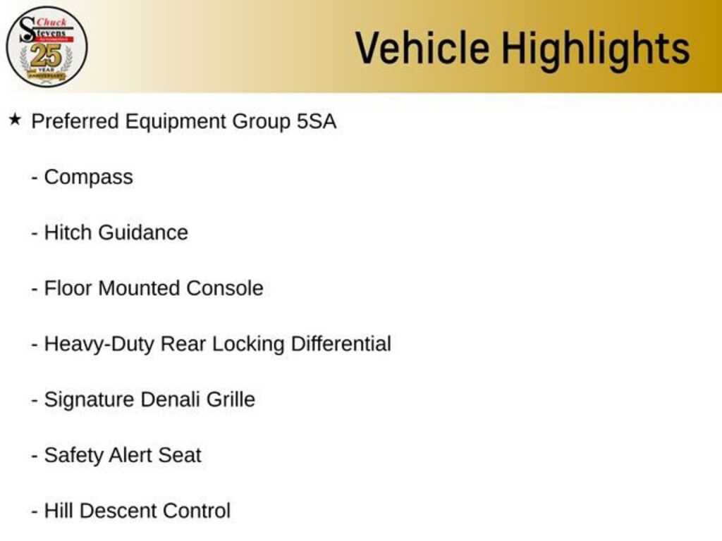12-Volt Rear Auxiliary Power Outlet, 120-Volt Bed Mounted Power Outlet, 120-Volt Instrument Panel Power Outlet, 170 Amp Alternator, 2 USB Ports, 2 USB Ports (1st Row), Alloy wheels, Auxiliary External Transmission Oil Cooler, Chrome Assist Steps, Chrome Recovery Hooks, Color-Keyed Carpeting Floor Covering, Compass, Deep-Tinted Glass, Denali Ultimate Package, Driver Alert Package I, Driver Alert Package II, Electric Rear-Window Defogger, Electrical Lock Control Steering Column, Floor Mounted Console, Following Distance Indicator, Forward Collision Alert, Front Pedestrian Braking, GMC 4G LTE, GMC Connected Access, GMC MultiPro Power Steps, HD Radio, HD Rear Vision Camera, HD Surround Vision, Heated 2nd Row Outboard Seats, Heated Driver & Front Passenger Seating, Heavy-Duty Rear Locking Differential, High-Capacity Air Filter, Hill Descent Control, Hitch Guidance, Hitch Guidance w/Hitch View, In-Vehicle Trailering App, Integrated Trailer Brake Controller, IntelliBeam Automatic High Beam On/Off, Keyless Open & Start, Lane Change Alert w/Side Blind Zone Alert, Lane Keep Assist w/Lane Departure Warning, LED Cargo Area Lighting, Low Speed Forward Automatic Braking, Manual Tilt-Wheel & Telescoping Steering Column, Multi-Color 15 Diagonal Head-Up Display, Navigation System, OnStar & GMC Connected Services Capable, Perimeter Lighting, Power Door Locks, Power Front Passenger Windows w/Express Up/Down, Power Front Windows w/Driver Express Up/Down, Power Rear Windows w/Express Down, Power Sliding Rear Window w/Rear Defogger, Power Sunroof, Preferred Equipment Group 5SA, Rear Camera Mirror, Rear Cross Traffic Alert, Rear Dual USB Charging-Only Ports, Rear Wheelhouse Liners, Remote Vehicle Starter System, Safety Alert Seat, Signature Denali Grille, Spray-On Pickup Bed Liner w/Denali Logo, Steering Wheel Audio Controls, Technology Package, Theft Deterrent System (Unauthorized Entry), Trailer Tire Pressure Monitor System, Trailering Package, Ultrasonic Front & Rear Park Assist, Universal Home Remote, Ventilated Driver & Front Passenger Seats, Wheels: 22 x 9 Polished Aluminum, Wireless Charging.