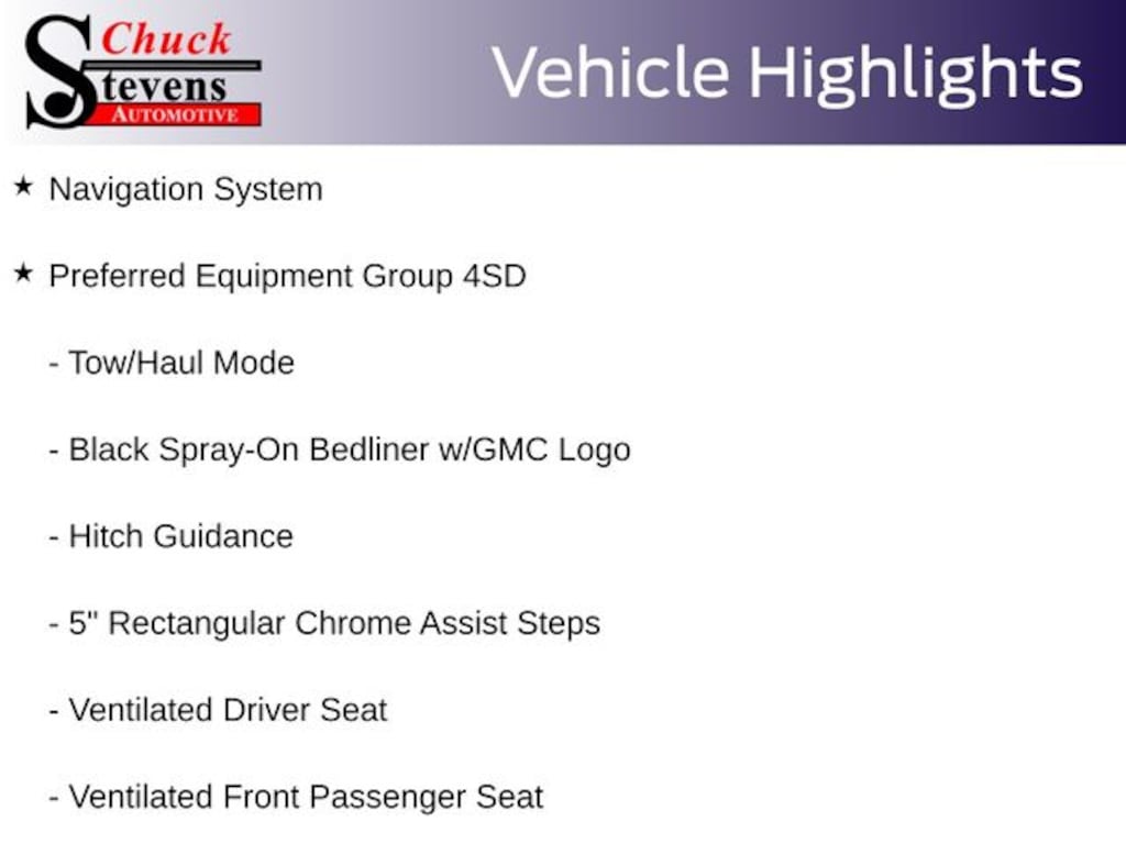 2 USB Data Ports, 5" Rectangular Chrome Assist Steps, Alloy wheels, AM/FM radio: SiriusXM with 360L, Apple CarPlay/Android Auto, Automatic temperature control, Black Spray-On Bedliner w/GMC Logo, Bose Premium 7-Speaker Audio System Feature, Driver Alert Package, Forward Collision Alert, Front fog lights, Fully automatic headlights, Genuine wood console insert, Genuine wood door panel insert, HD Radio, Heated Driver & Front Passenger Seats, Heated front seats, Heated Steering Wheel, Hitch Guidance, Integrated Trailer Brake Controller, Lane Departure Warning System, Navigation System, Perforated Leather-Appointed Seat Trim, Polished Exhaust Tip, Preferred Equipment Group 4SD, Premium audio system: GMC Infotainment System, Radio: AM/FM w/8" Diagonal Multi-Touch Display Nav, Remote keyless entry, SiriusXM Radio, Steering wheel mounted audio controls, Telescoping steering wheel, Tilt steering wheel, Tow/Haul Mode, Trailering Package, Ultrasonic Rear Parking Assist, Ventilated Driver Seat, Ventilated Front Passenger Seat, Wheels: 20" x 8.5" Diamond Cut Machined Aluminum.