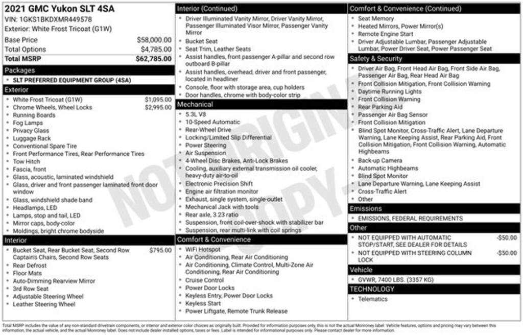 2021 GMC Yukon SLT 4D Sport Utility SLT White Frost Tricoat RWD EcoTec3 5.3L V8 10-Speed Automatic with Overdrive