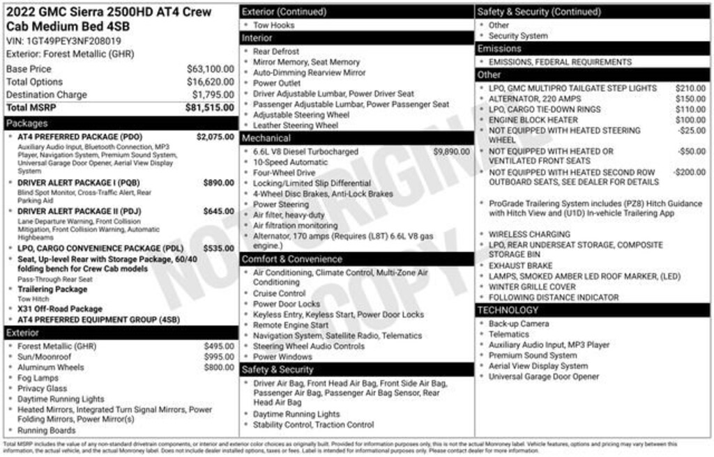 Welcome to Chuck Stevens Chevrolet located on HWY 31 South, Bay Minette Alabama. We are home of Lifetime Powertrain Warranty. A Lifetime Powertrain Warranty at no additional cost. Grab a great deal with our low-price guarantee on this 2022 GMC Sierra 2500HD while we still have it. At Chuck Stevens Chevrolet our Pre-Owned vehicles have been fully inspected and reconditioned by a certified technician. The Forest Metallic 2022 GMC Sierra 2500HD with Jet Black With Kalahari Accents Leather interior is a fantastic choice.The online price includes a $2,500 Cash Down or trade equity. To qualify, customers must trade in a vehicle with a minimum appraised value of $2,500 or Cash Down. All prices reflect dealership financing and include a $1,000 finance coupon. See dealer for full details.Recent Arrival!2022 GMC Sierra 2500HD AT4 Forest Metallic 4D Crew Cab AT4 4WD Duramax 6.6L V8 Turbodiesel 10-Speed AutomaticLIFETIME POWERTRAIN WARRANTY PROGRAM is included at no additional charge for all vehicles that have less than 80,000 miles. It is one of the most comprehensive powertrain warranty programs in the market. See dealer for details.