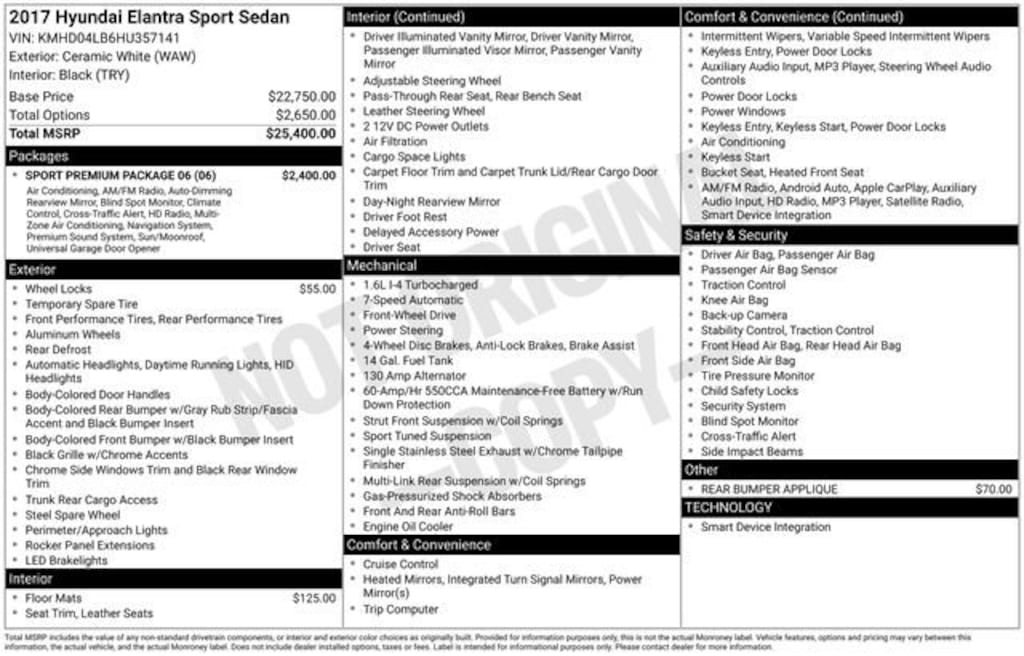 Used 2017 HyundaiElantra Sport Sedan I-4 gasoline direct injection, DOHC, variable valve control, intercooled turbo, regular unleade