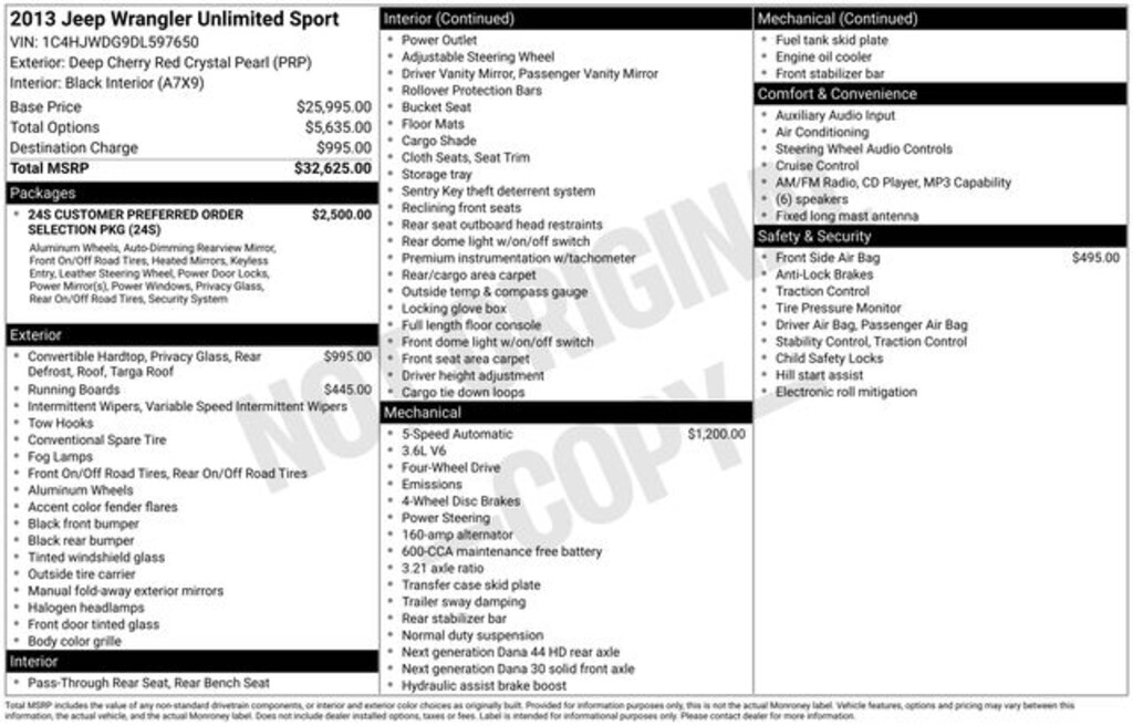 Take advantage of our low-price guarantee on this 2013 Jeep Wrangler. This Wrangler comes finished in Deep Cherry Red Crystal Pearlcoat with a Black Interior interior, making it a wonderful choice for your next vehicle.
