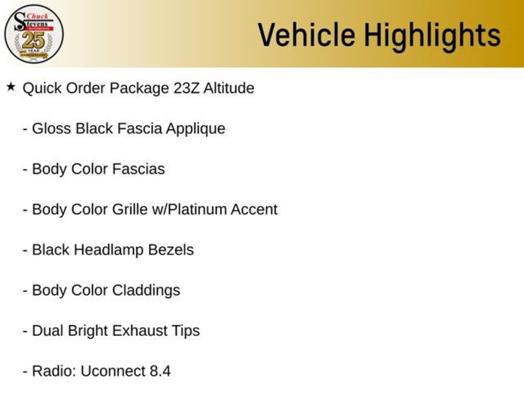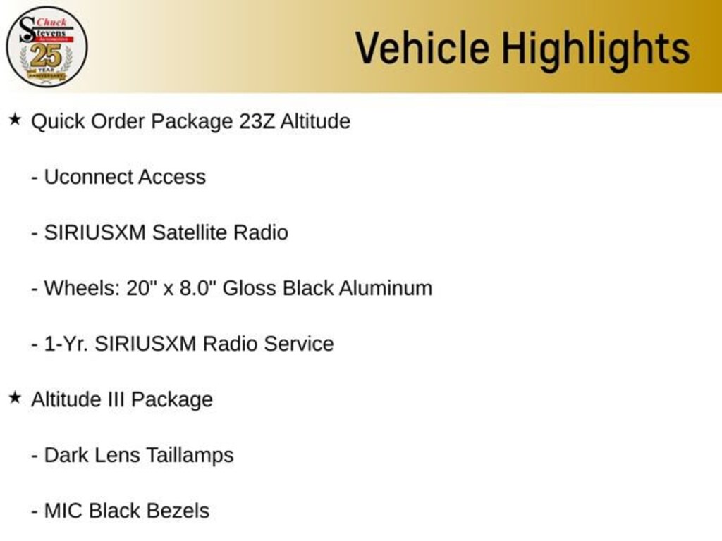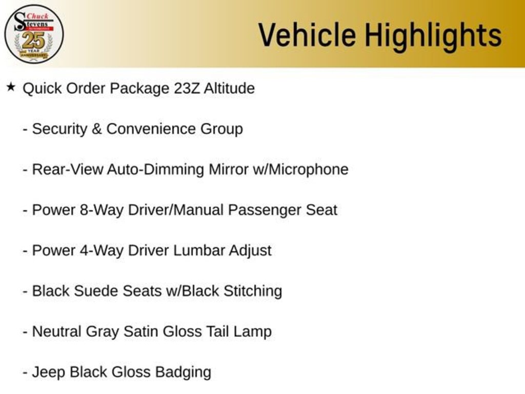 Inside, the Black Suede seats with Black stitching create a premium and comfortable cabin environment. Enjoy the convenience of the Power Liftgate, the security of the Uconnect Access system, and the comfort of the Heated Front Seats and Heated Steering Wheel. The Rear-View Auto-Dimming Mirror with Microphone and the ParkView Rear Back-Up Camera provide added peace of mind and ease of use.