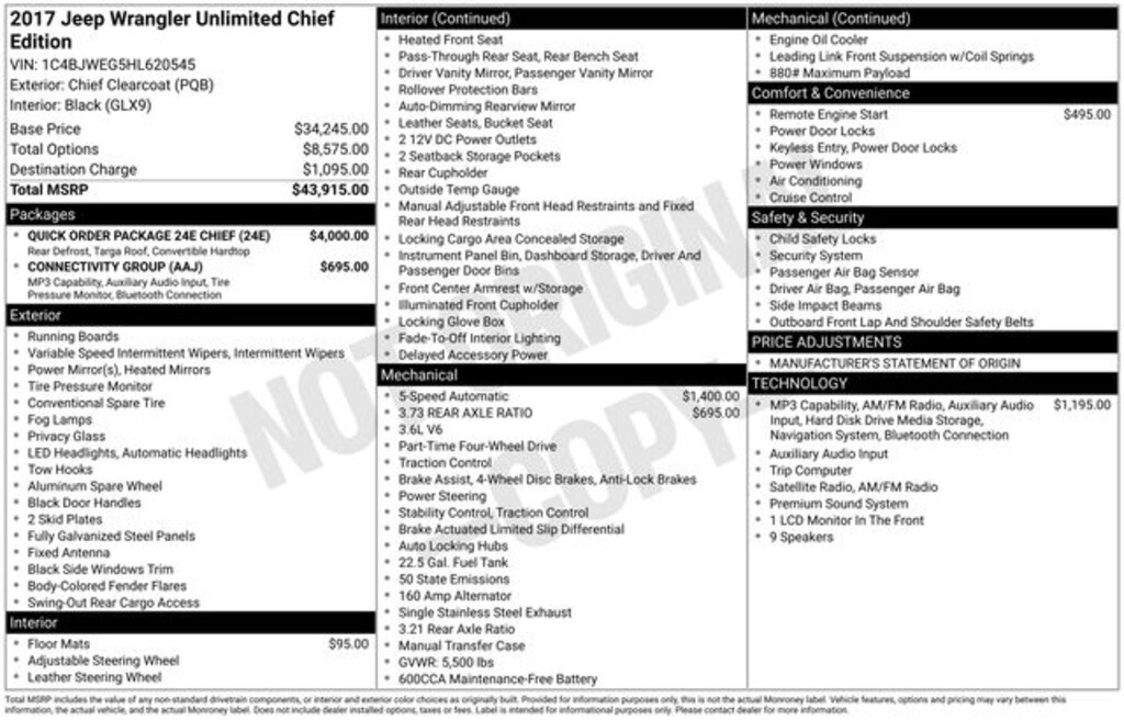 Welcome to Chuck Stevens Dodge Chrysler Jeep Ram Fiat located on HWY 31 South, Bay Minette Alabama. We are home of The Lifetime Powertrain Warranty at no additional cost. Grab a great deal with our low-price guarantee on this 2017 Jeep Wrangler while we still have it. At Chuck Stevens our Pre-Owned vehicles have been fully inspected and reconditioned by a certified technician. The Chief Clearcoat 2017 Jeep Wrangler with Black Leather interior is a superb choice.