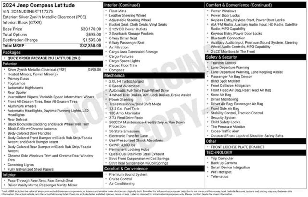 Take advantage of our low-price guarantee on this 2024 Jeep Compass. This Compass comes finished in Silver Zynith Metallic Clearcoat with a Black interior, making it a superb choice for your next vehicle.