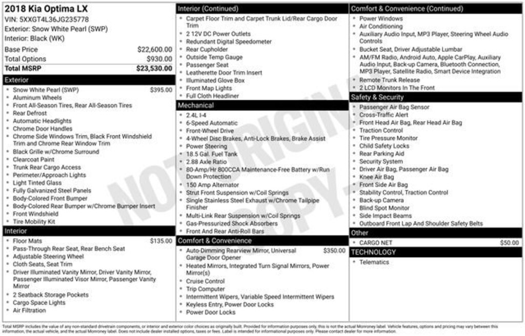 Welcome to Chuck Stevens Chevrolet located on HWY 31 South, Bay Minette Alabama. We are home of Lifetime Powertrain Warranty. A Lifetime Powertrain Warranty at no additional cost. Grab a great deal with our low-price guarantee on this 2018 Kia Optima while we still have it. At Chuck Stevens Chevrolet our Pre-Owned vehicles have been fully inspected and reconditioned by a certified technician. The Snow White Pearl 2018 Kia Optima with Black Cloth interior is a fantastic choice.The online price includes a $2,500 Cash Down or trade equity. To qualify, customers must trade in a vehicle with a minimum appraised value of $2,500 or Cash Down. All prices reflect dealership financing and include a $1,000 finance coupon. See dealer for full details.Recent Arrival! 25/36 City/Highway MPG2018 Kia Optima LX Snow White Pearl 4D Sedan LX FWD 2.4L I4 DGI DOHC 6-Speed Automatic with SportmaticLIFETIME POWERTRAIN WARRANTY PROGRAM is included at no additional charge for all vehicles that have less than 80,000 miles. It is one of the most comprehensive powertrain warranty programs in the market. See dealer for details.