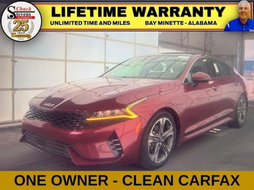 Welcome to Chuck Stevens Chevrolet located on HWY 31 South, Bay Minette Alabama. We are home of Lifetime Powertrain Warranty. A Lifetime Powertrain Warranty at no additional cost. Grab a great deal with our low-price guarantee on this 2023 Kia K5 while we still have it. At Chuck Stevens Chevrolet our Pre-Owned vehicles have been fully inspected and reconditioned by a certified technician. The Passion Red 2023 Kia K5 with Black interior is an outstanding choice.The online price includes a $2,500 Cash Down or trade equity. To qualify, customers must trade in a vehicle with a minimum appraised value of $2,500 or Cash Down. All prices reflect dealership financing and include a $1,000 finance coupon. See dealer for full details.Recent Arrival! 27/37 City/Highway MPG2023 Kia K5 EX Passion Red 4D Sedan EX FWD 1.6L I4 DGI Turbocharged DOHC 16V LEV3-ULEV70 180hp 8-Speed AutomaticLIFETIME POWERTRAIN WARRANTY PROGRAM is included at no additional charge for all vehicles that have less than 80,000 miles. It is one of the most comprehensive powertrain warranty programs in the market. See dealer for details.
