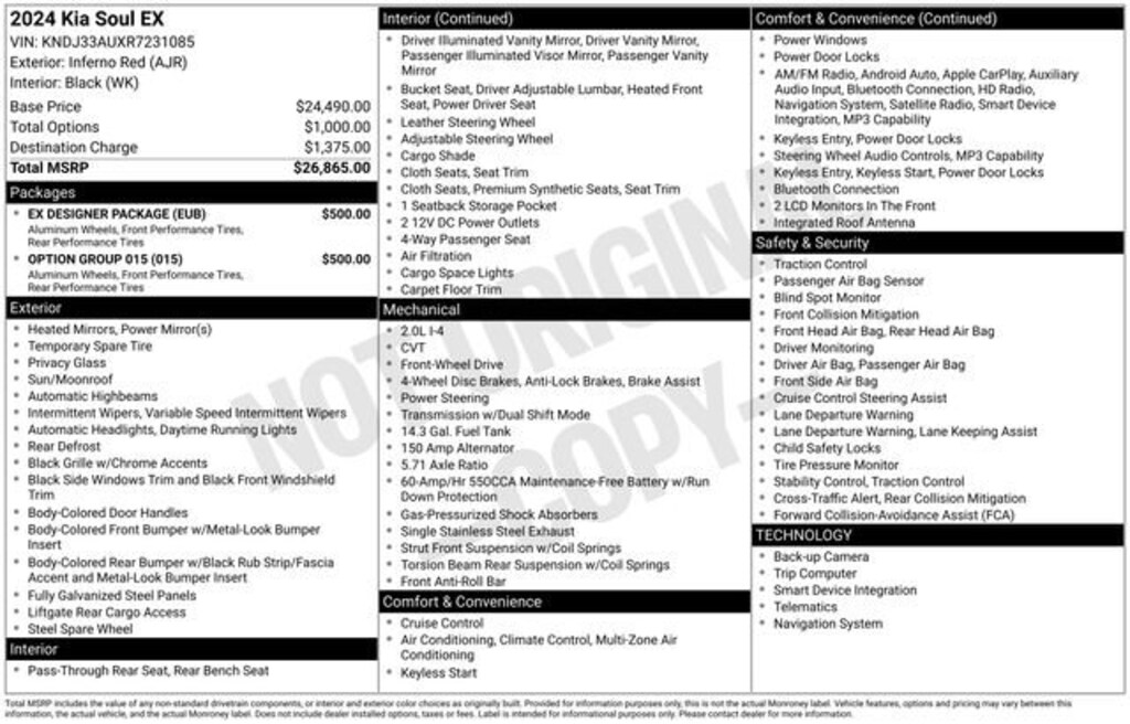 Welcome to Chuck Stevens Chevrolet located on HWY 31 South, Bay Minette Alabama. We are home of Lifetime Powertrain Warranty. A Lifetime Powertrain Warranty at no additional cost. Grab a great deal with our low-price guarantee on this 2024 Kia Soul while we still have it. At Chuck Stevens Chevrolet our Pre-Owned vehicles have been fully inspected and reconditioned by a certified technician. The Inferno Red 2024 Kia Soul with Black Cloth interior is a terrific choice.The online price includes a $2,500 Cash Down or trade equity. To qualify, customers must trade in a vehicle with a minimum appraised value of $2,500 or Cash Down. All prices reflect dealership financing and include a $1,000 finance coupon. See dealer for full details.Clean CARFAX.Recent Arrival! 27/33 City/Highway MPG2024 Kia Soul EX Inferno Red 4D Hatchback EX FWD 2.0L I4 DOHC CVTLIFETIME POWERTRAIN WARRANTY PROGRAM is included at no additional charge for all vehicles that have less than 80,000 miles. It is one of the most comprehensive powertrain warranty programs in the market. See dealer for details.