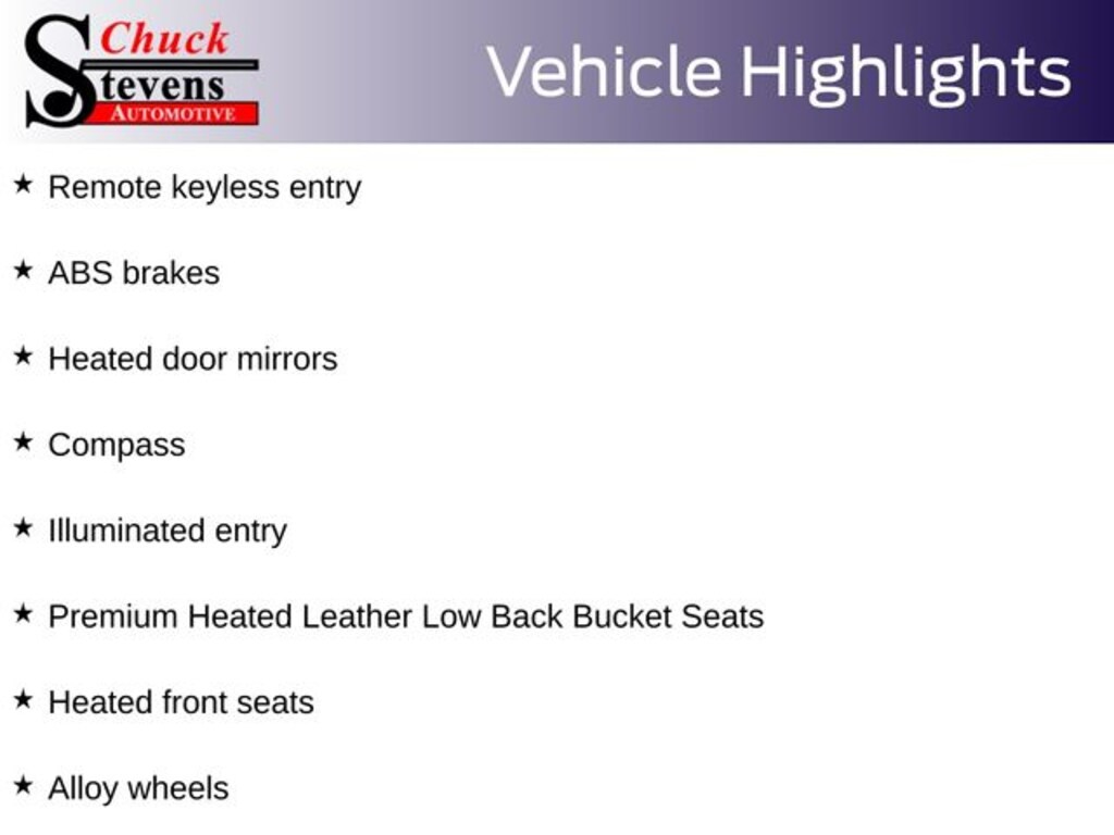 ABS brakes, Alloy wheels, Compass, Heated door mirrors, Heated front seats, Illuminated entry, Premium Heated Leather Low Back Bucket Seats, Remote keyless entry.