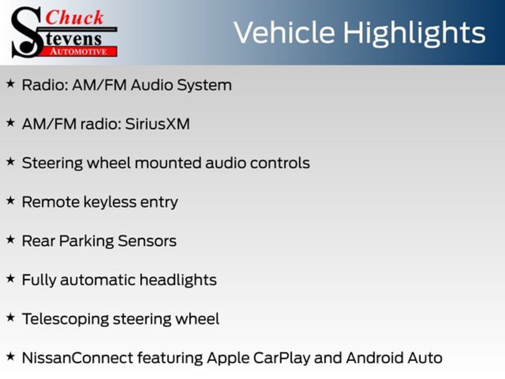17" Machined Alloy Wheels, Alloy wheels, AM/FM radio: SiriusXM, Front Bucket Seats, Fully automatic headlights, NissanConnect featuring Apple CarPlay and Android Auto, Radio: AM/FM Audio System, Rear Parking Sensors, Remote keyless entry, Steering wheel mounted audio controls, Telescoping steering wheel, Tilt steering wheel.