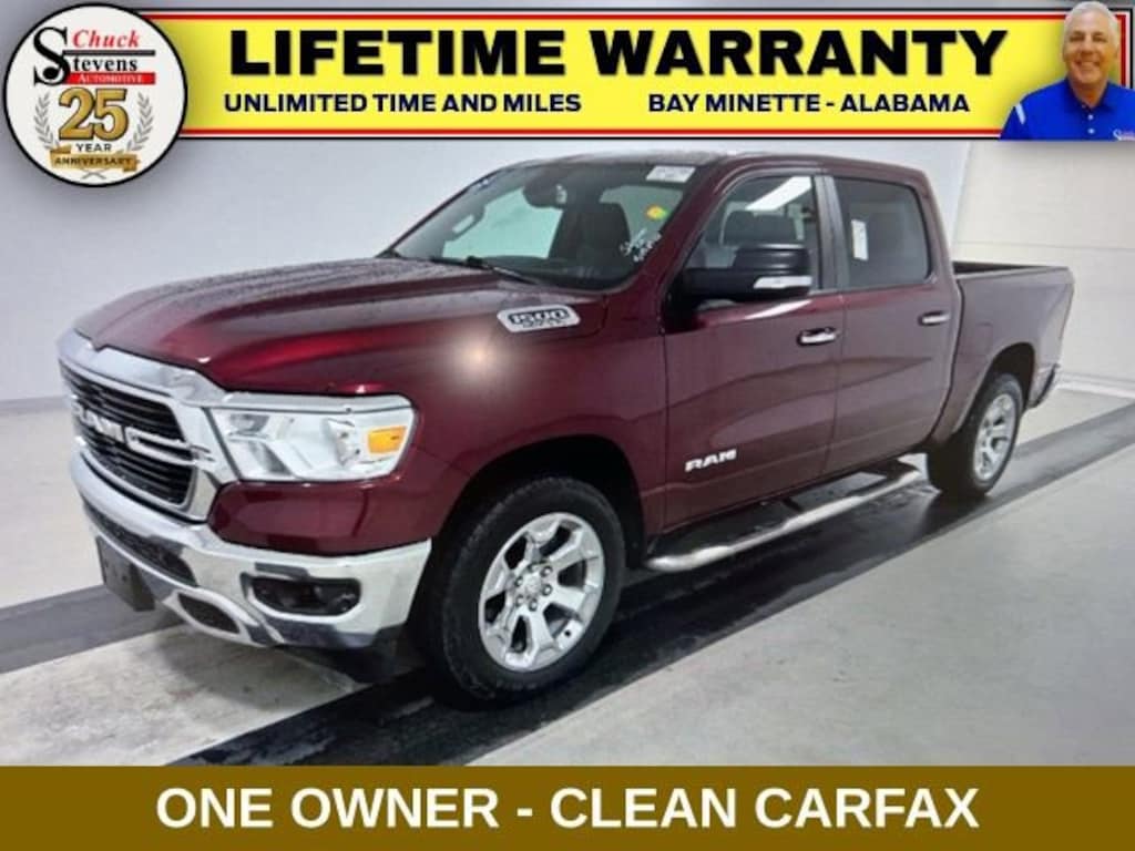 Welcome to Chuck Stevens Chevrolet located on HWY 31 South, Bay Minette Alabama. We are home of Lifetime Powertrain Warranty. A Lifetime Powertrain Warranty at no additional cost. Grab a great deal with our low-price guarantee on this 2019 Ram 1500 while we still have it. At Chuck Stevens Chevrolet our Pre-Owned vehicles have been fully inspected and reconditioned by a certified technician. The Delmonico Red Pearlcoat 2019 Ram 1500 with Black Cloth interior is a wonderful choice.
