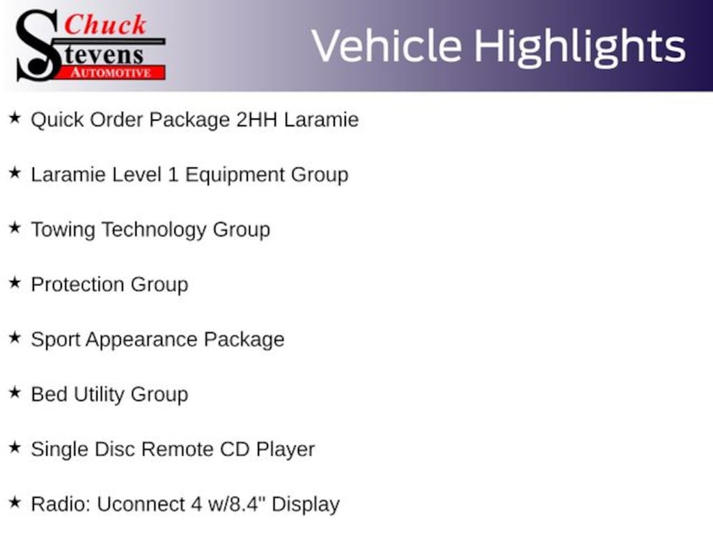 2nd Row In Floor Storage Bins, 5th Wheel/Gooseneck Towing Prep Group, Alloy wheels, AM/FM radio: SiriusXM, Auto High Beam Headlamp Control, Bed Utility Group, Black Interior Accents, Blind Spot & Cross Path Detection, Body Color Door Handles, Body Color Grille Surround, CTR Stop Lamp w/Cargo View Camera, Deployable Bed Step, Exterior Mirrors w/Memory, Foam Bottle Insert (Door Trim Panel), Laramie Level 1 Equipment Group, LED Bed Lighting, Mirror-Mounted Aux Reverse Lamps, Painted Front Bumper, Painted Rear Bumper, Power Adjustable Convex Aux Mirrors, Power Adjustable Pedals w/Memory, Power Chrome Tow Mirrors w/Convex Spotter & Memory, Protection Group, Quick Order Package 2HH Laramie, Radio: Uconnect 4 w/8.4" Display, Radio/Driver Seat/Mirrors/Pedals Memory, Rain Sensitive Windshield Wipers, Remote Tailgate Release, Selectable Tire Fill Alert, Single Disc Remote CD Player, Sport Appearance Package, Sport Decal, Spray In Bedliner, Surround View Camera System, Towing Technology Group, Trailer Reverse Guidance, Ventilated Front Seats, Wheels: 18" x 8.0" Polished Aluminum.