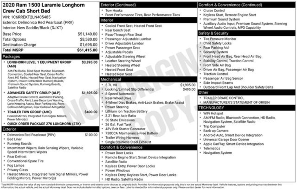 2020 Ram 1500 Laramie Longhorn 4D Crew Cab Laramie Longhorn Delmonico Red Pearlcoat RWD HEMI 5.7L V8 Multi Displacement VVT 8-Speed Automatic