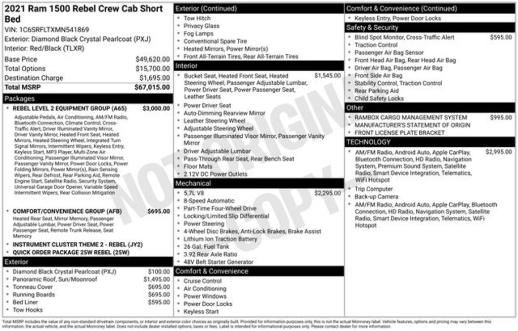 2021 Ram 1500 Rebel 4D Crew Cab Rebel Diamond Black Crystal Pearlcoat 4WD HEMI 5.7L V8 Multi Displacement VVT 8-Speed Automatic