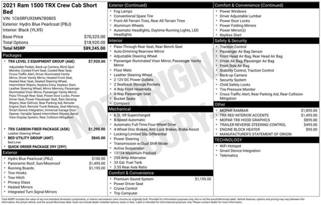 2021 Ram 1500 TRX 4D Crew Cab TRX Hydro Blue Pearlcoat 4WD 6.2L Supercharged HEMI V8 SRT 8-Speed Automatic
